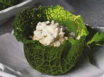 Разделить листья цикория, промыть и обсушить. Кондитерским шприцем выложить пюре на листья цикория. Тут же подавать.