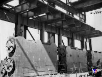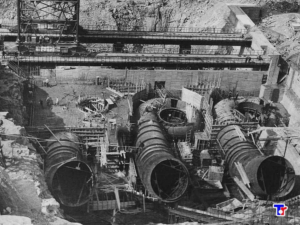Машинный зал и административное здание. Водоприемник и подводящий канал. Водосброс и труба строительных расходов на месте сегодняшней плотины.