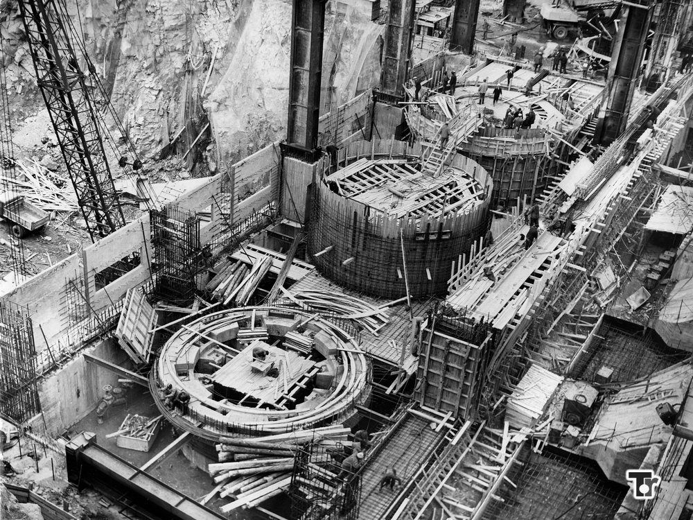 Река Воронья. Узкий каньон перед порогом Большой Падун. Теперь здесь водосброс и плотина. Фотографии строительства Серебрянской ГЭС-2. Река Воронья в трубе строительных расходов.